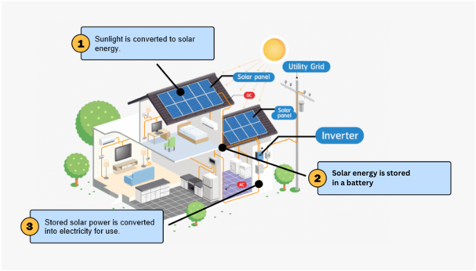 Solar energy is generated by sunlight captured by solar panels. This energy is then stored in your solar system battery. When needed, your inverter converts the stored solar energy into electricity for use.